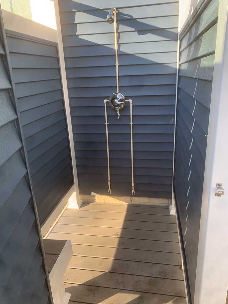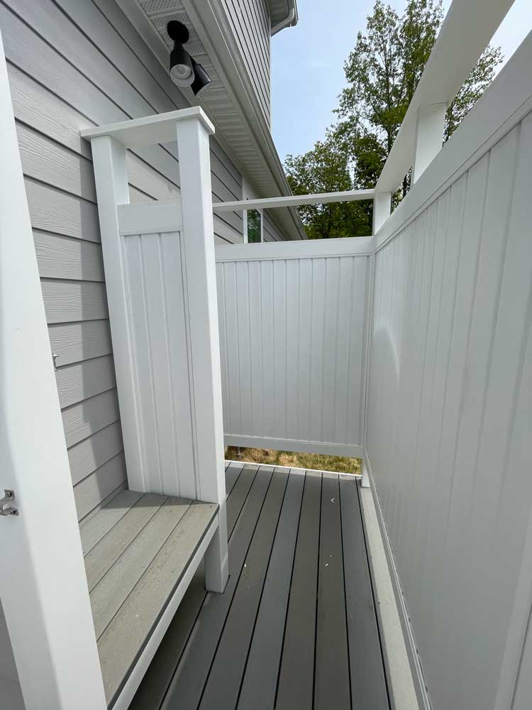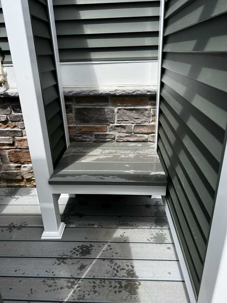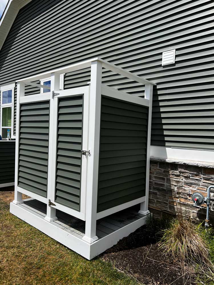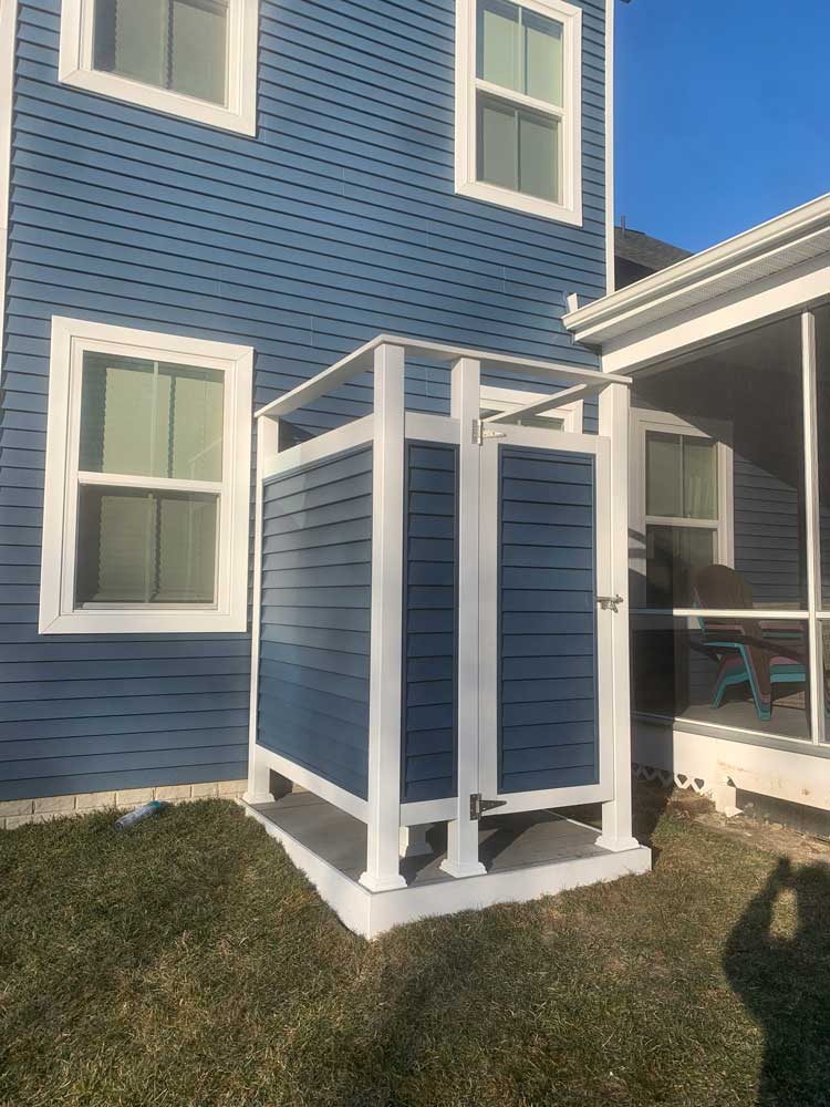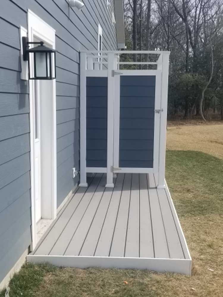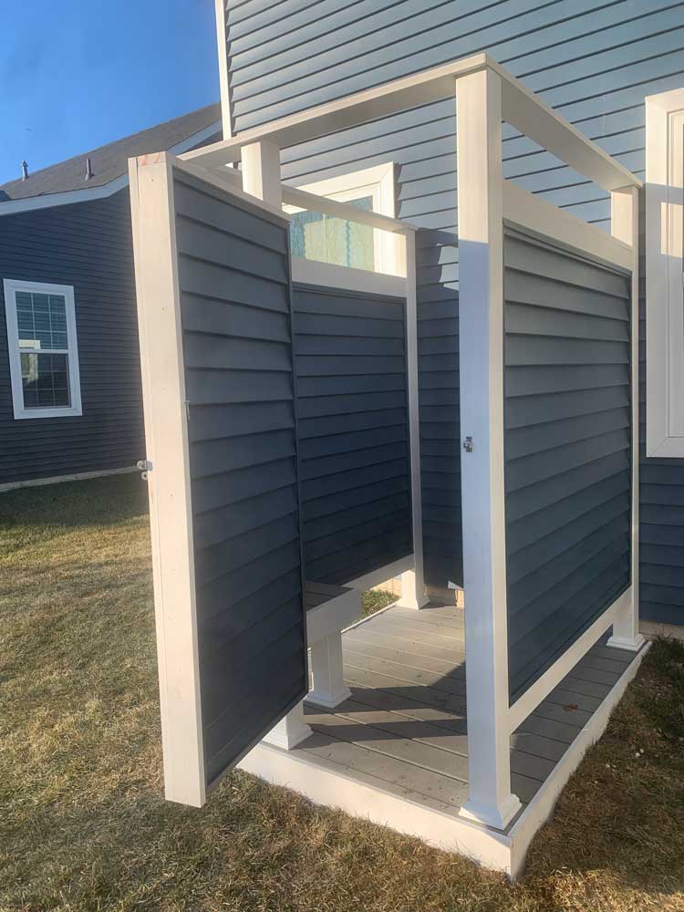 BTM Construction Inc. can build an outside shower stall to create the privacy you need to rinse off all the mess before you even step inside your home. We offer a 4ft by 4ft shower stall only or 5ft by 7ft with a separation wall and bench. The Shower stall is built with a Composite deck floor and all-white vinyl or siding color to match the home. Plumbing services are not included.