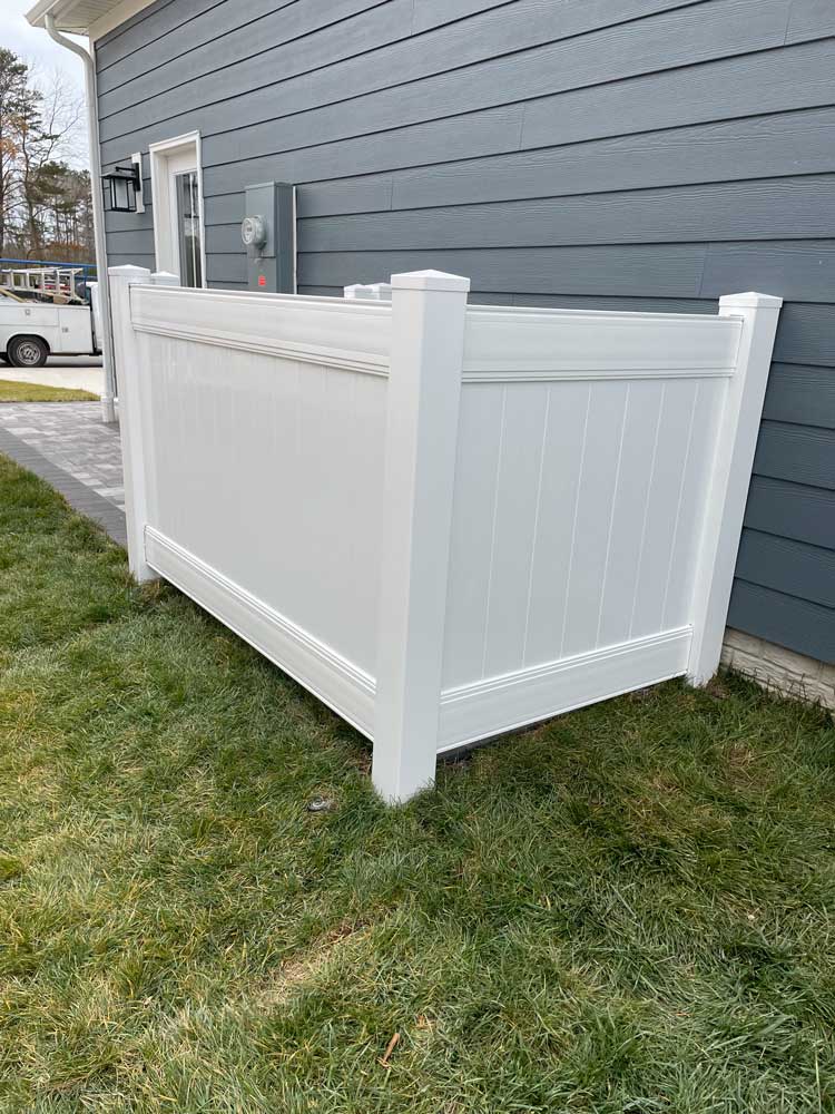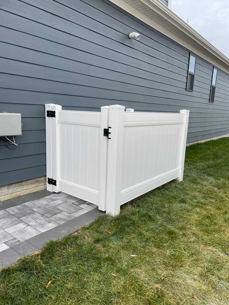 Our standard size is 4ft by 6ft, open at the rear, but we can build to any dimensions and offer a gate or door for full enclosure. Our enclosures are available in all-white vinyl or a siding color to match your home!